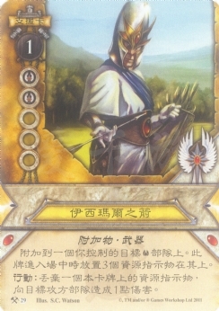 功能说明附加到一个你控制的目标高等精灵部队上。此牌进入场中时放置3个资源指示物在其上。