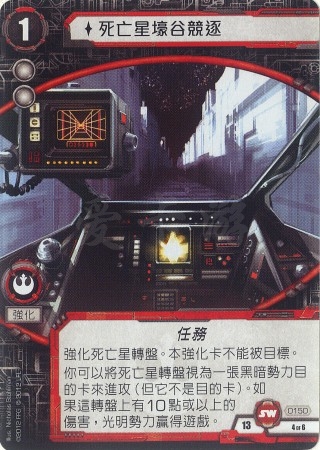 你可以将死亡星转盘视为一张黑暗势力目的卡来进攻(但它不是目的卡)。如果这转盘上有10点或以上的伤害,光明势力赢得游戏。