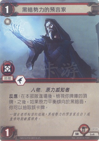 说明反应:在本部队进场后,检视你牌库的顶牌。之后,如果原力平衡倾向于黑暗面,你可以抽取该卡牌。