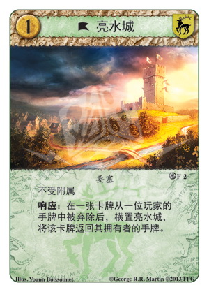 :在一张卡牌从一位玩家的手牌中被弃除后,横置亮水城,将该卡牌返回其拥有者的手牌。