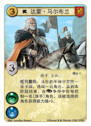 功能说明 任何阶段:从你的手牌中弃除一张卡牌,选择一名角色。直到本阶段结束,在阴谋争夺争夺中你每控制一名[旗手]角色,该被选择的角色获得能力值+3。"