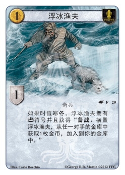 功能说明 如果时值寒冬,浮冰渔夫拥有权力争夺符号并且获得“备战:横置浮冰渔夫,从任一对手的金库中获取1枚金币,加入到你的金库中。”