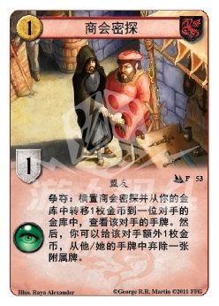 功能说明 争夺:横置商会密探并从你的金库中转移1枚金币到一位对手的金库中,查看该对手的手牌。然后,你可以给该对手额外1枚金币,从他/她的手牌中弃除一张附属牌。